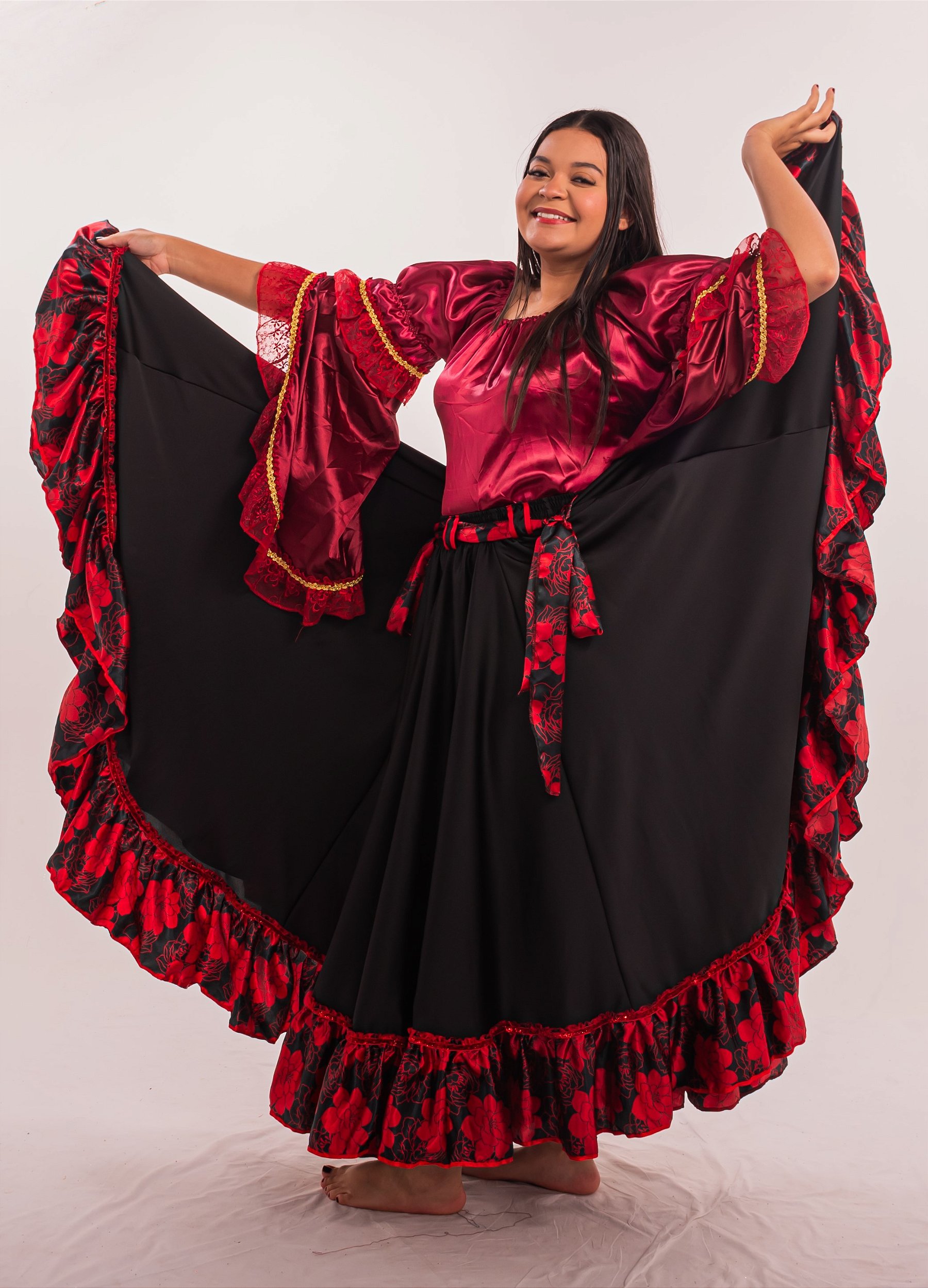 Não procure mais, Saia Longa Estilo Cigana! Esta linda saia é feita de um tecido leve e tem um lindo caimento. Ela é confeccionada em Acetinado e cetim, e tem metros de roda de 14 metros.