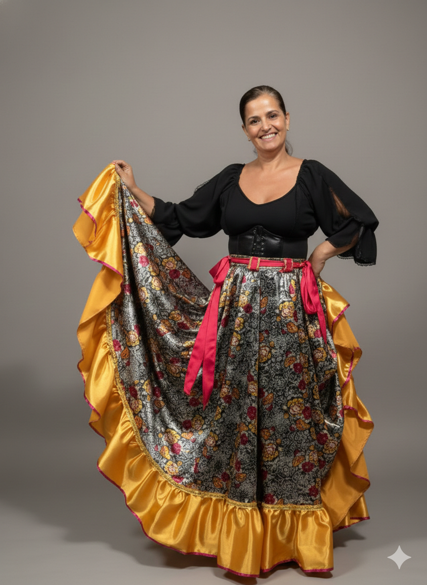 Linda Saia Cigana confeccionada em Cetim com Babado em Cetim além de fino acabamento, com aproximadamente 12 metros de roda.