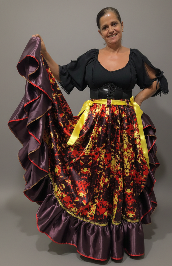 Linda Saia Cigana confeccionada em Cetim com Babado em Cetim além de fino acabamento, com aproximadamente 12 metros de roda.