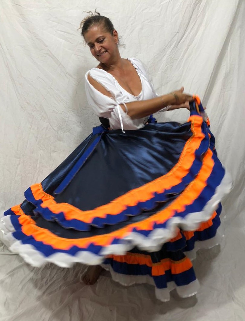 Linda Saia Cigana confeccionada em Acetinado com Babados em Chiffon além de fino acabamento, com aproximadamente 14 metros de roda.