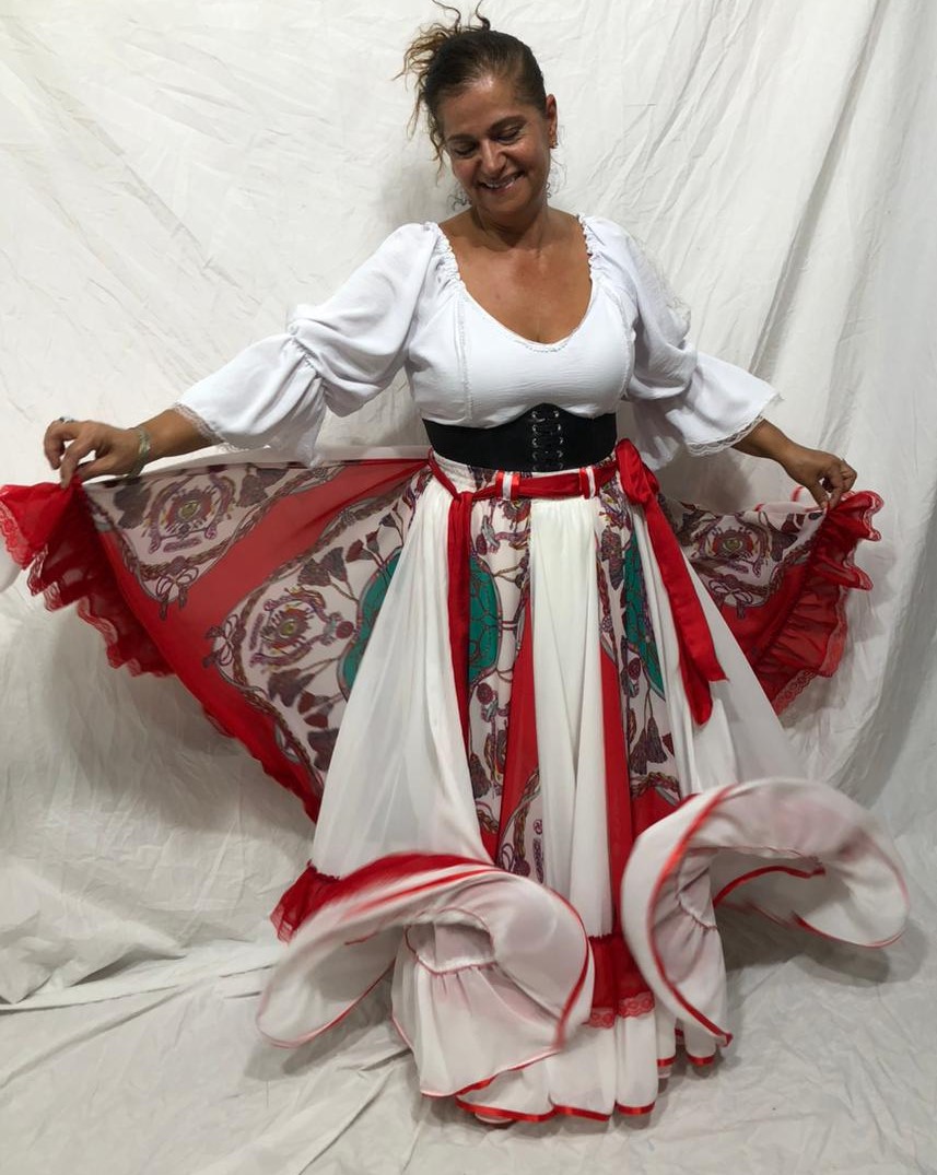 Linda Saia Cigana confeccionada em Chiffon com Babados em Acetinado além de fino acabamento, com aproximadamente 14 metros de roda.
