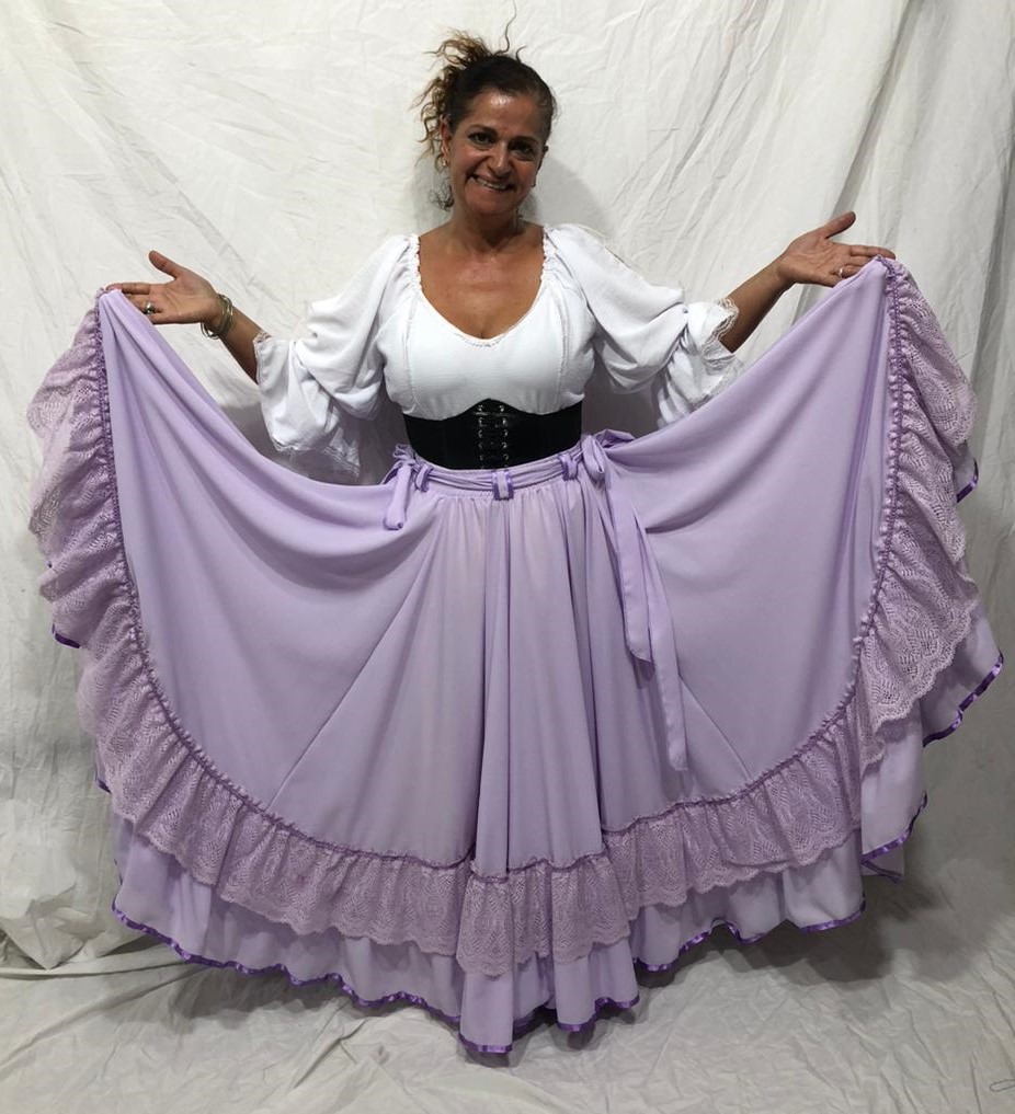 Linda Saia Cigana confeccionada em Crepinho com Babados em Crepinho e Renda além de fino acabamento, com aproximadamente 14 metros de roda.