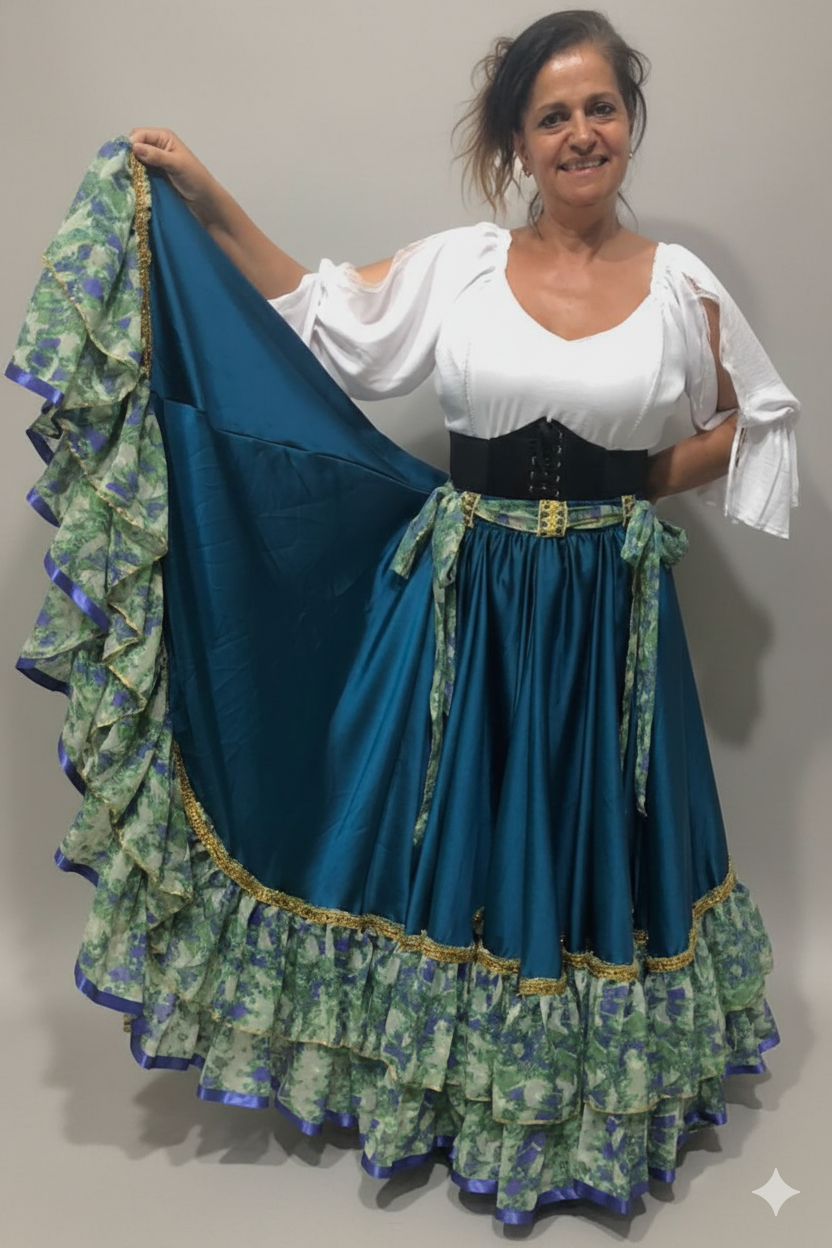 Linda Saia Cigana confeccionada em Acetinado com Babados em Chiffon além de fino acabamento, com aproximadamente 14 metros de roda.