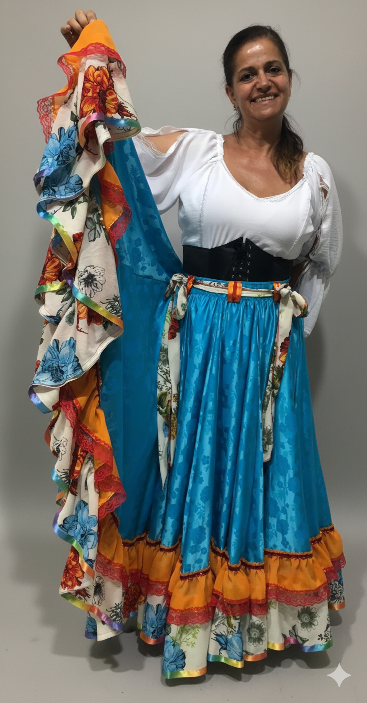 Linda Saia Cigana confeccionada em Jacquard com Babados em Crepinho e Chiffon além de fino acabamento, com aproximadamente 14 metros de roda.