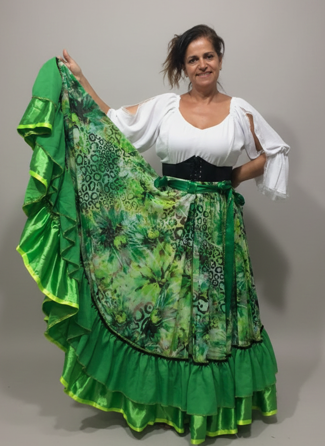 Linda Saia Cigana confeccionada em Chiffon com Babados em Cetim e Chiffon além de fino acabamento, com aproximadamente 14 metros de roda.