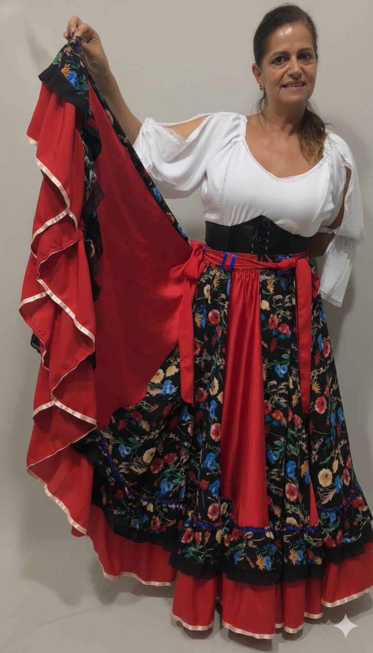 Linda Saia Cigana confeccionada em Acetinado e Crepinho com Babados em Acetinado e Crepinho além de fino acabamento, com aproximadamente 14 metros de roda.