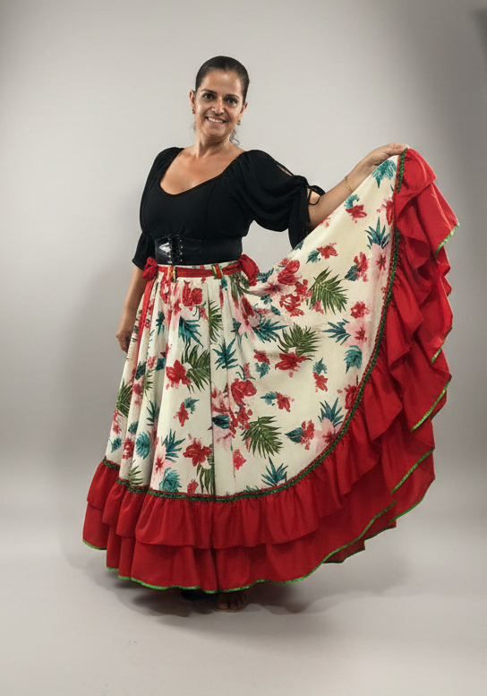 Linda Saia Cigana confeccionada em Crepinho com Babados em Acetinado além de fino acabamento, com aproximadamente 14 metros de roda.