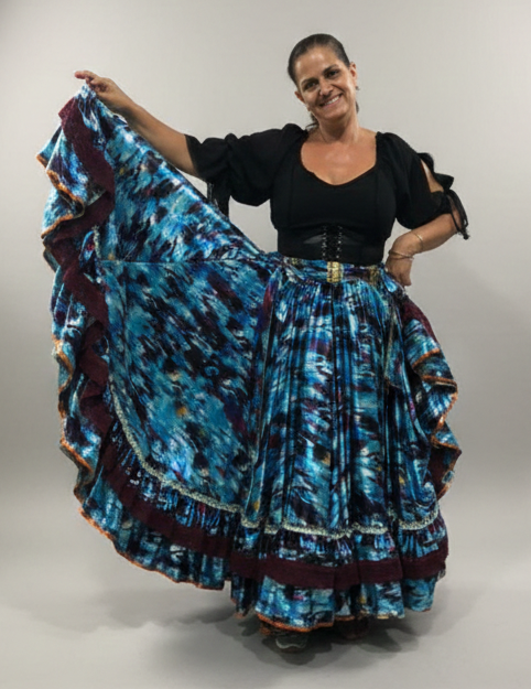 Linda Saia Cigana confeccionada em Acetinado com Babados em Acetinado além de fino acabamento, com aproximadamente 14 metros de roda.