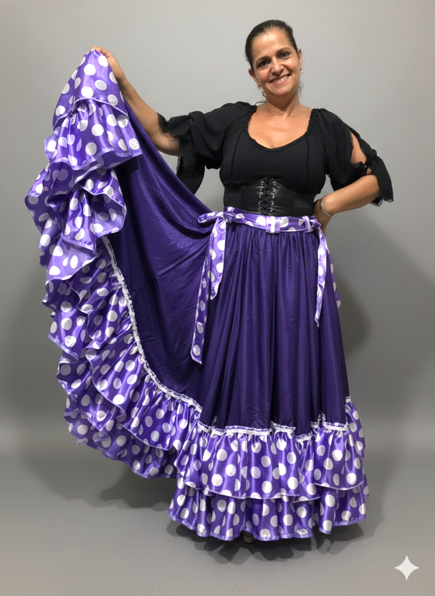 Linda Saia Cigana confeccionada em Acetinado com Babados em Cetim de Poá além de fino acabamento, com aproximadamente 14 metros de roda.