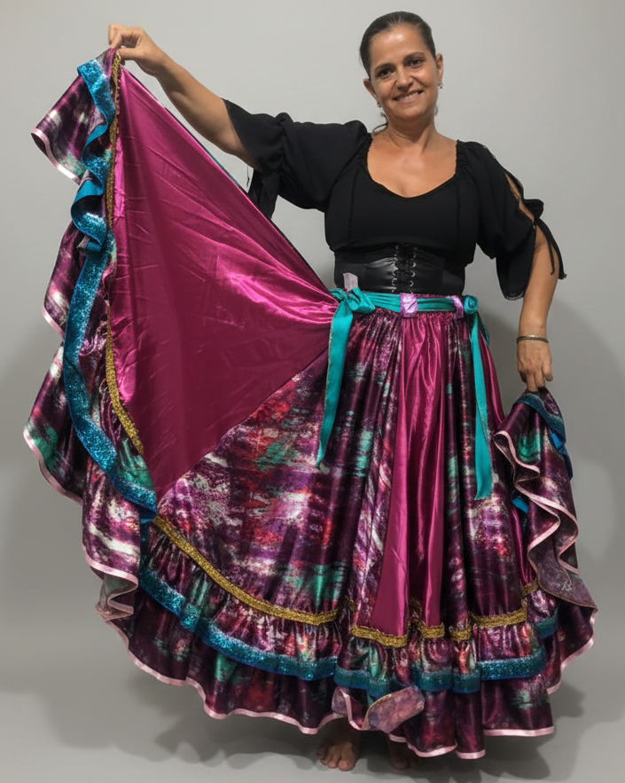 Linda Saia Cigana confeccionada em Cetim com Babados em Cetim além de fino acabamento, com aproximadamente 14 metros de roda.