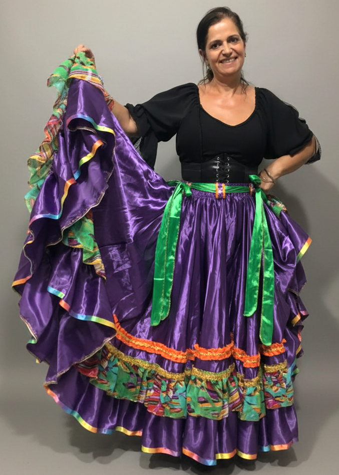 Linda Saia Cigana confeccionada em Cetim com Babados em Cetim E Chiffon além de fino acabamento, com aproximadamente 14 metros de roda.