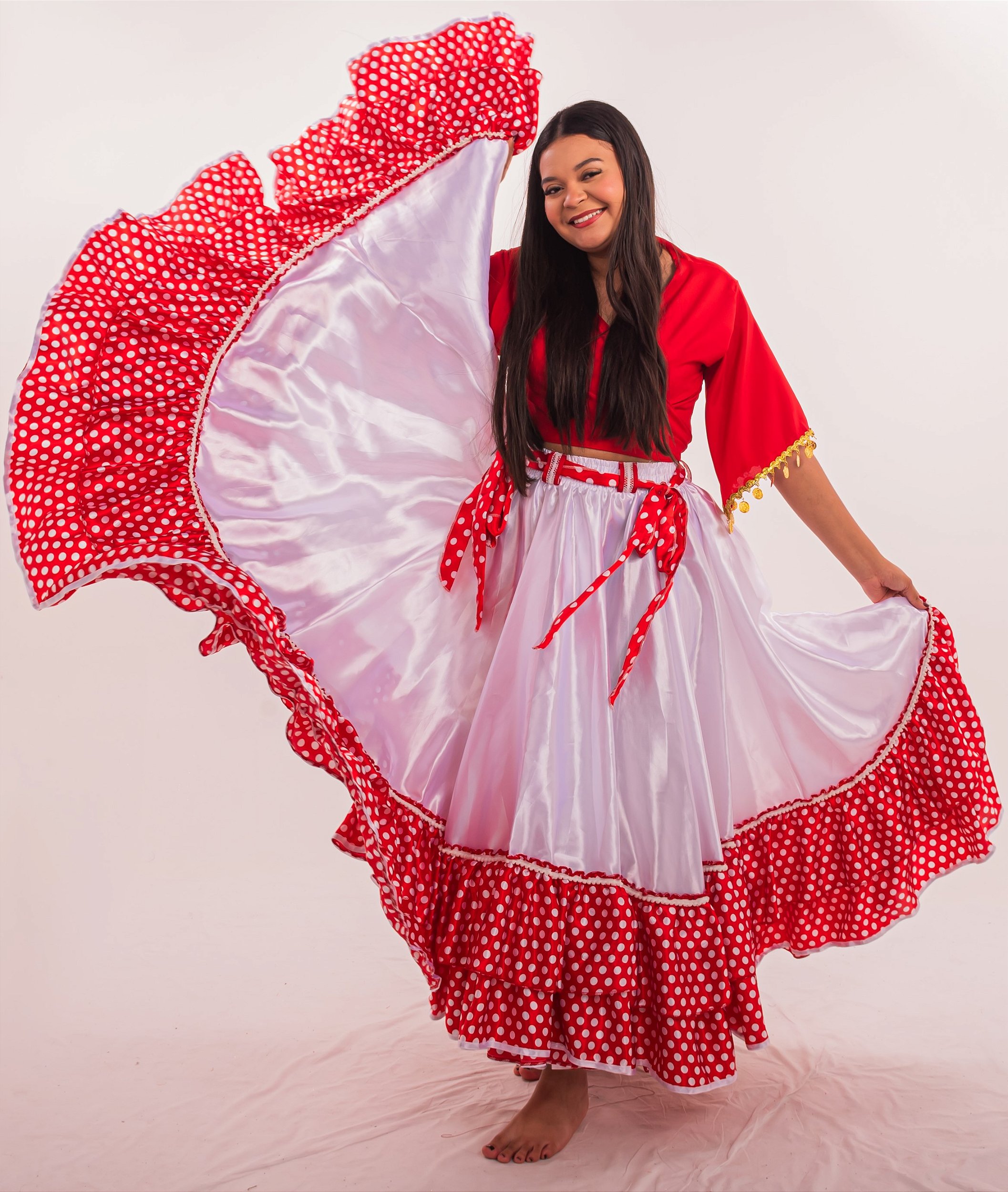 Linda Saia Cigana confeccionada em Cetim com Babados em Cetim de Poá além de fino acabamento, com aproximadamente 14 metros de roda.