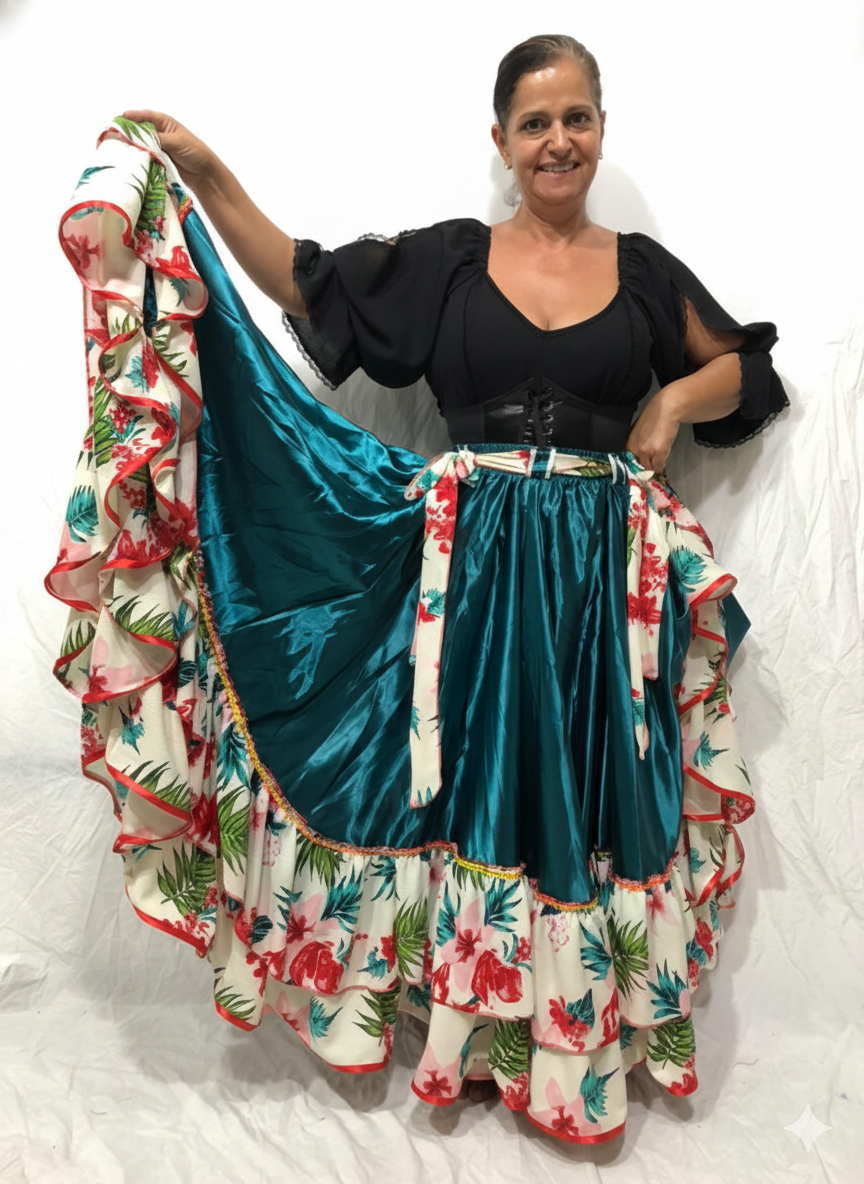 Linda Saia Cigana confeccionada em Cetim com Babados em Crepinho além de fino acabamento, com aproximadamente 14 metros de roda.