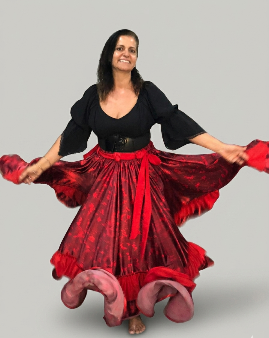 Linda Saia Cigana confeccionada em Acetinado com Babados em Acetinado além de fino acabamento, com aproximadamente 14 metros de roda.