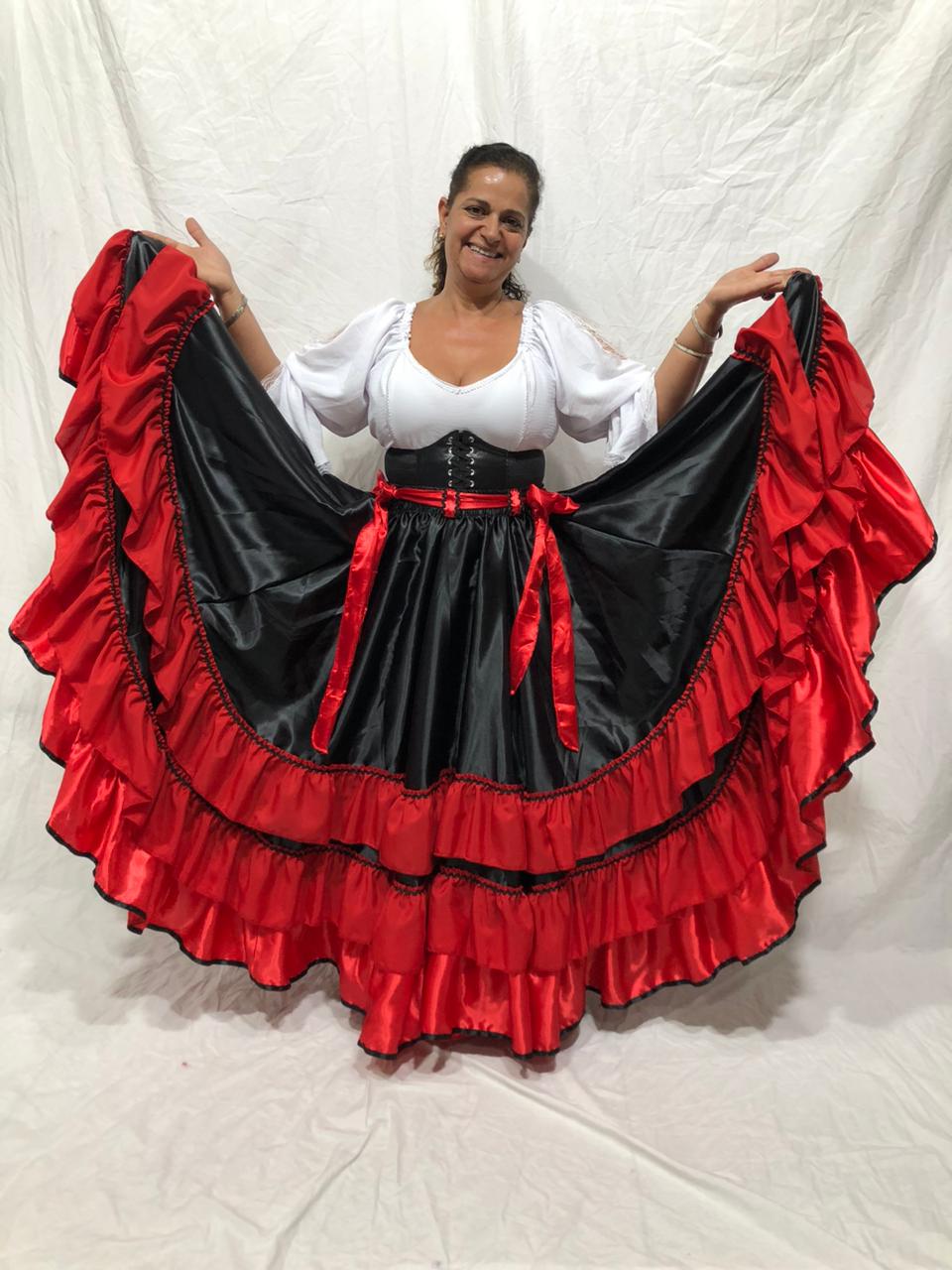 Linda Saia Cigana confeccionada em Cetim com Babados em Cetim além de fino acabamento, com aproximadamente 14 metros de roda.