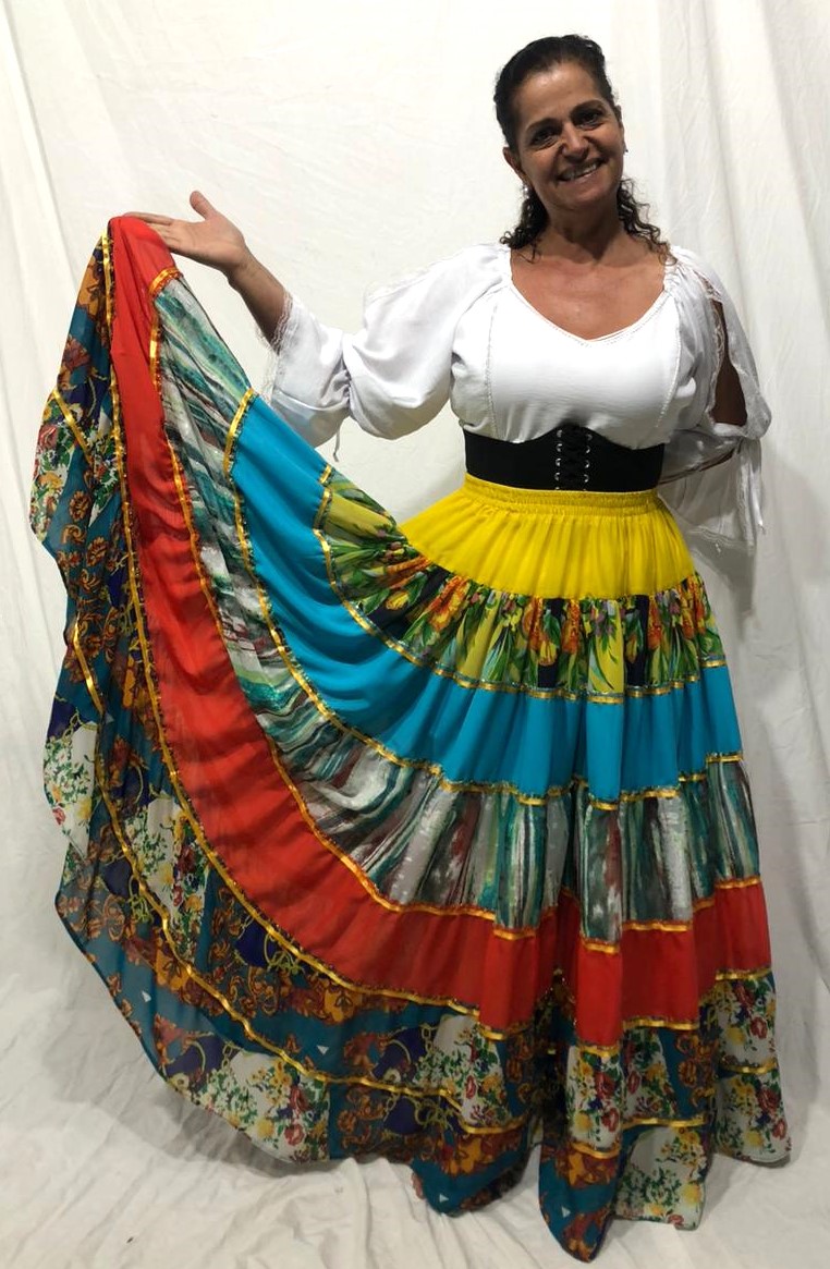Não procure mais, Saia Longa Estilo Cigana! Esta linda saia é feita de um tecido leve e tem um lindo caimento. Ela é confeccionada em Chiffon, e tem 12 metros de roda