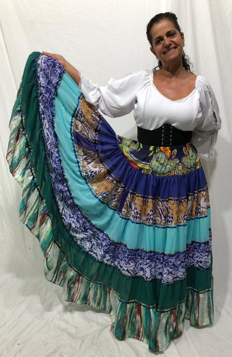 Saia Longa Cigana Modelo Patchwork com 12 metros de roda Azul