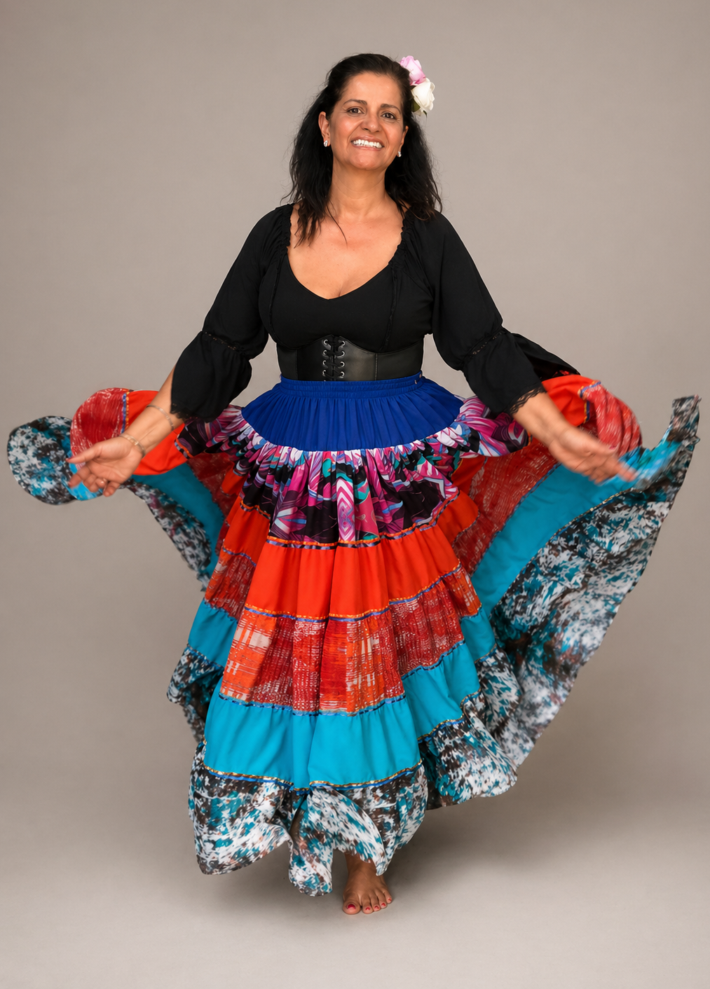 Basta colocar a Saia Longa Estilo Cigana e ajustar o cós para um caimento perfeito. Você também pode complementar a saia com um cinto ou outros acessórios para criar um visual único.