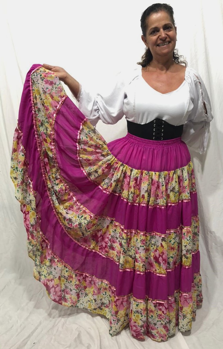Não procure mais, Saia Longa Estilo Cigana! Esta linda saia é feita de um tecido leve e tem um lindo caimento. Ela é confeccionada em Chiffon, e tem 12 metros de roda