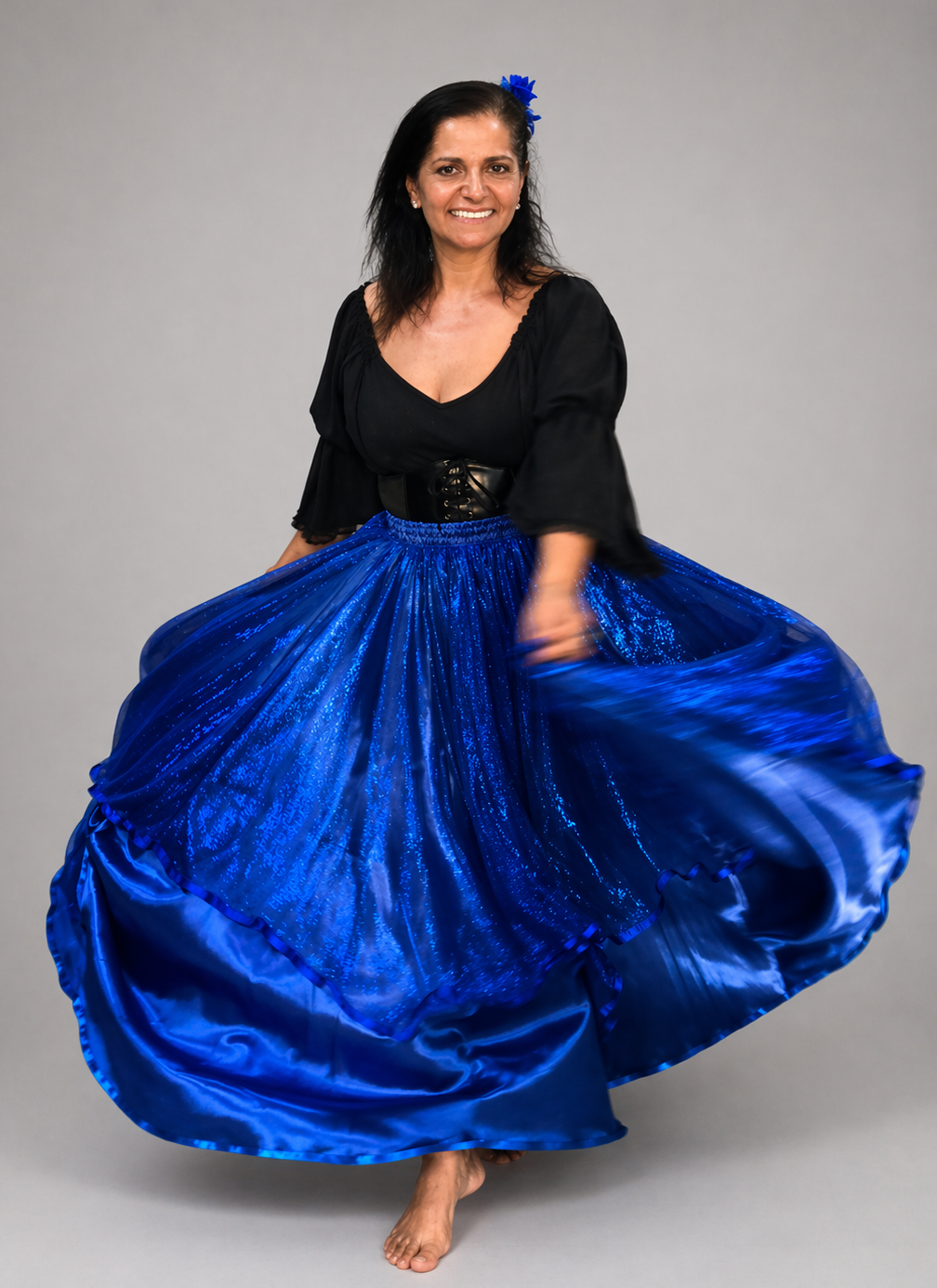 Linda Saia Cigana confeccionada em Cetim e Sobre Saia Pontas de Tecido de Brilho além de fino acabamento , com aproximadamente 10 metros de roda.