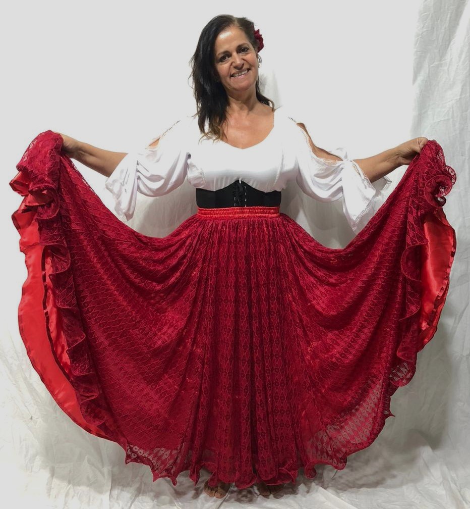 Linda Saia Cigana confeccionada em Cetim com Saia em Renda por cima além de fino acabamento, com aproximadamente 12 metros de roda.
