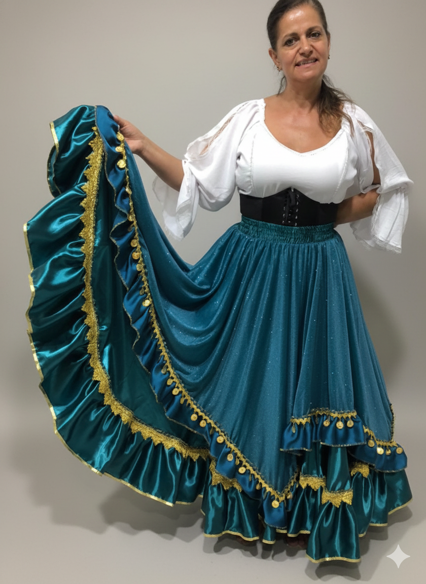 Linda Saia Cigana confeccionada em Cetim com Babado em Cetim e Sobre Saia de Renda além de fino acabamento , com aproximadamente 14 metros de roda.