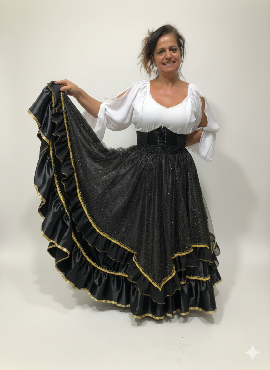 Saia Longa Cigana Modelo Sobre Saia Preta com 13 metros de roda